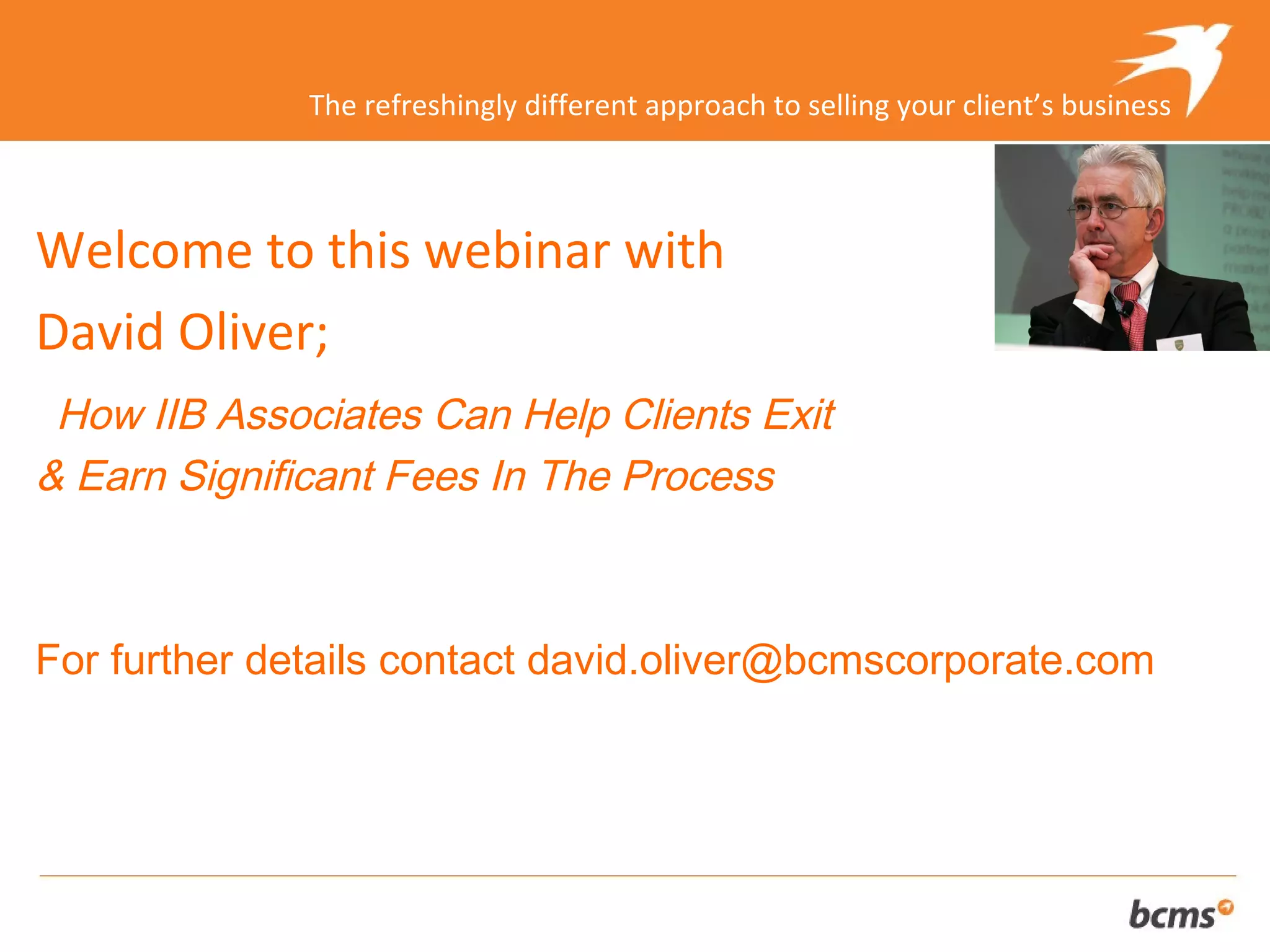 The document discusses a partnership approach between IIB Associates and BCMS Corporate to help clients exit their businesses and earn significant fees in the process. BCMS Corporate provides a refreshingly different approach to selling businesses by finding strategic buyers through extensive research and generating multiple offers to achieve premium sale prices above traditional valuations. The partnership allows IIB Associates to earn referral fees, shares of success fees, wealth management fees, and tax strategy fees when helping clients sell their businesses through BCMS Corporate's process.