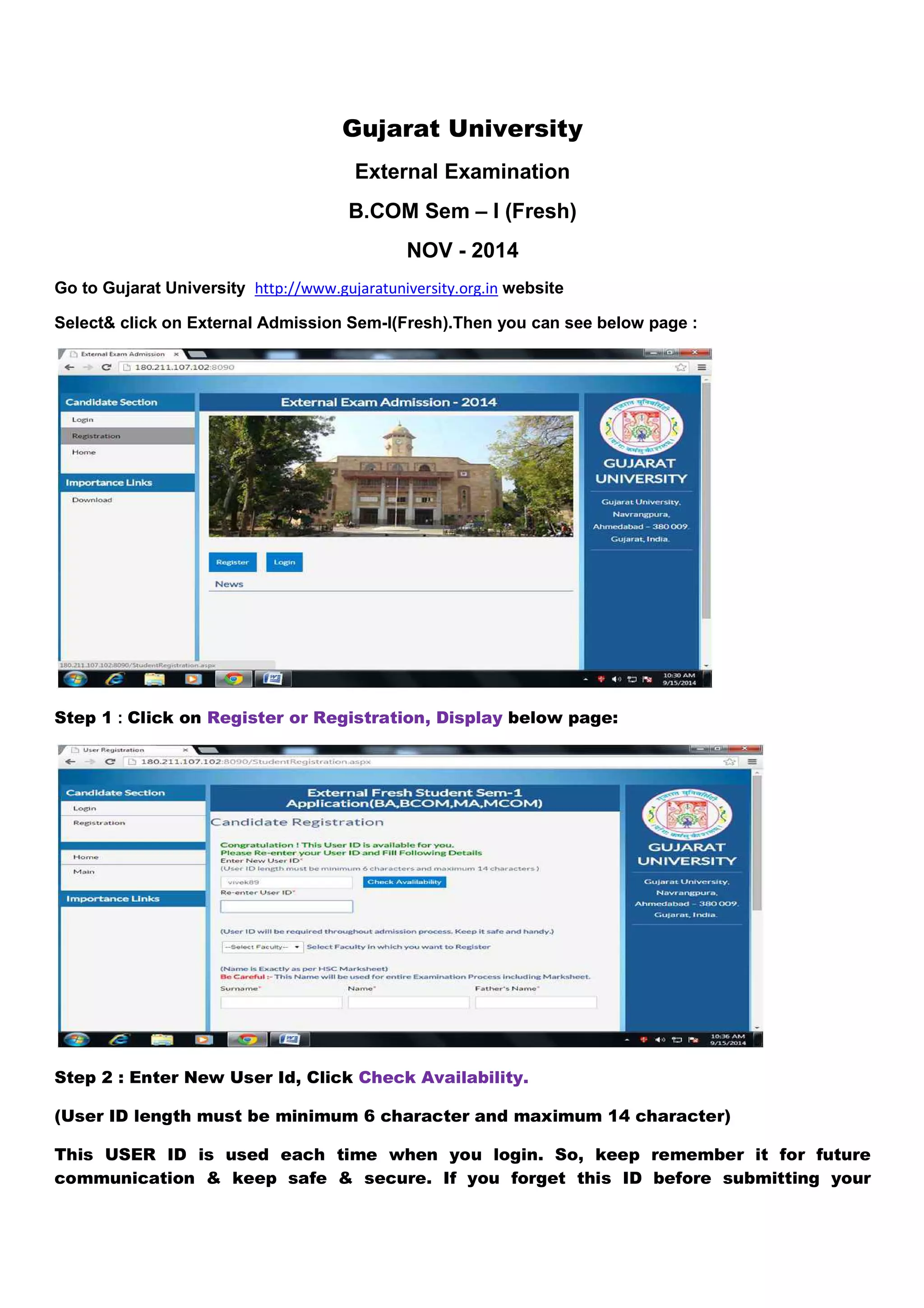 This document provides instructions for registering online and submitting an application form for external examinations with Gujarat University. It outlines 13 steps for completing the registration and application, including creating an account, filling in personal details, selecting subjects, uploading a photo and signature, reviewing the application, and submitting it along with supporting documents to a local post office. Key details like name, registration number, and user ID must be recorded for future login and communication with the university.
