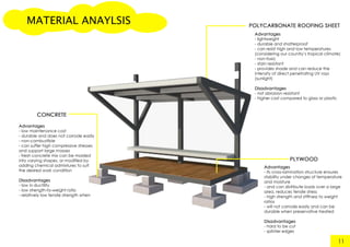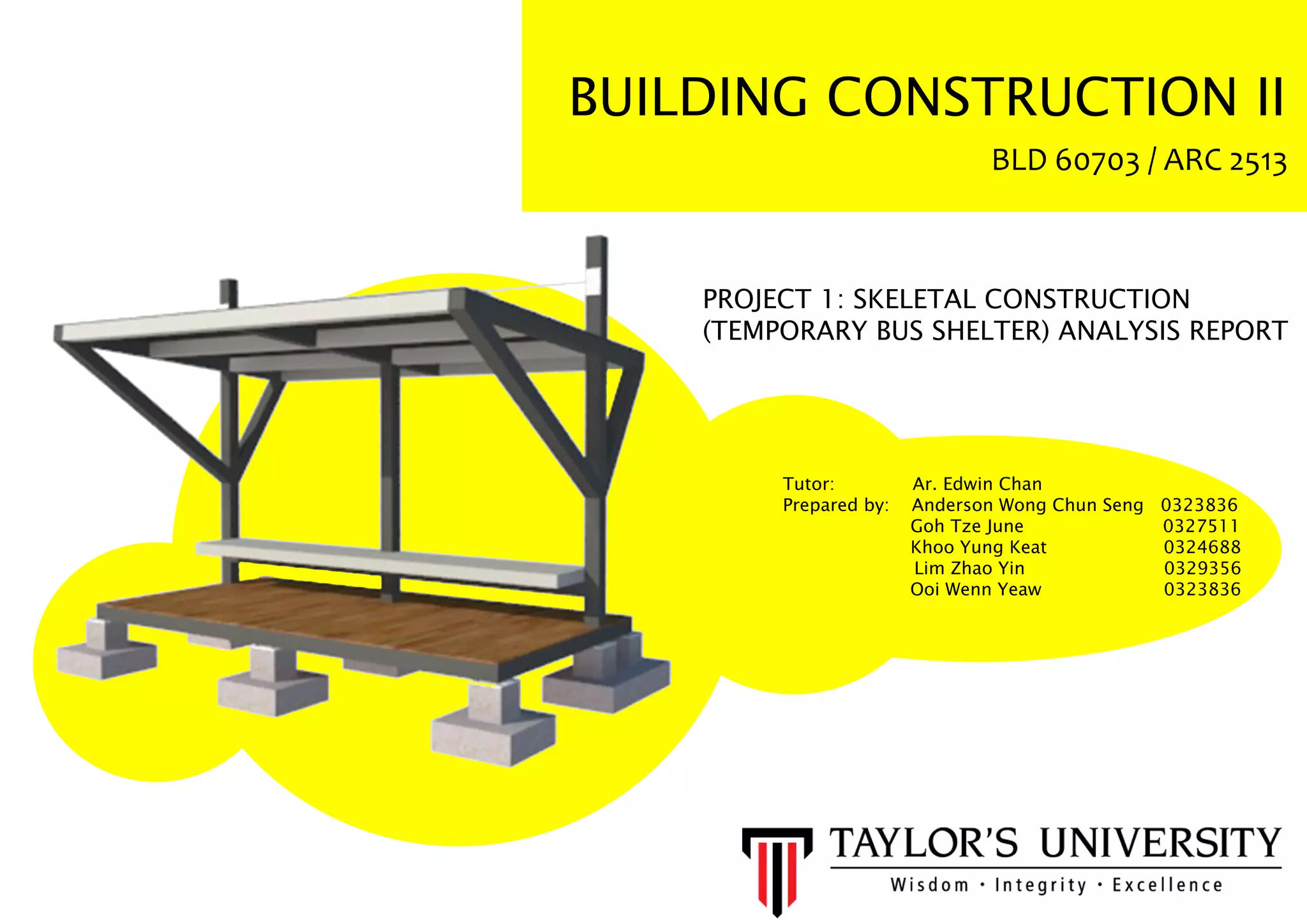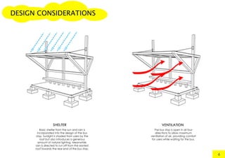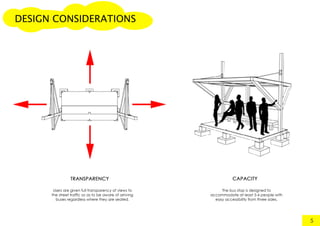 This document provides an analysis report for a project to construct a 1:5 scale model of a temporary bus shelter with a maximum height of 600mm and base area of 400mm x 800mm. It includes sections on the design concept, massing, design development, drawings, material analysis, construction details, structural analysis, and conclusions. The goal was to demonstrate an understanding of skeletal construction and how structures react under loading. The design combined a triangular prism roof with a cuboid base to provide shelter for 5-6 users with an emphasis on practical construction and user needs.