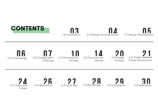 The document summarizes a student project to design and construct a 1:5 scale model of a temporary bus shelter. It includes an introduction outlining the project requirements. The design considerations section discusses factors like weather resistance, stability, ergonomics and material suitability. Orthographic drawings and photos of the construction process are provided. Construction details show connections between structural elements. A design analysis section rationalizes design choices. Finally, the skeletal frame members of the bus shelter are listed.
