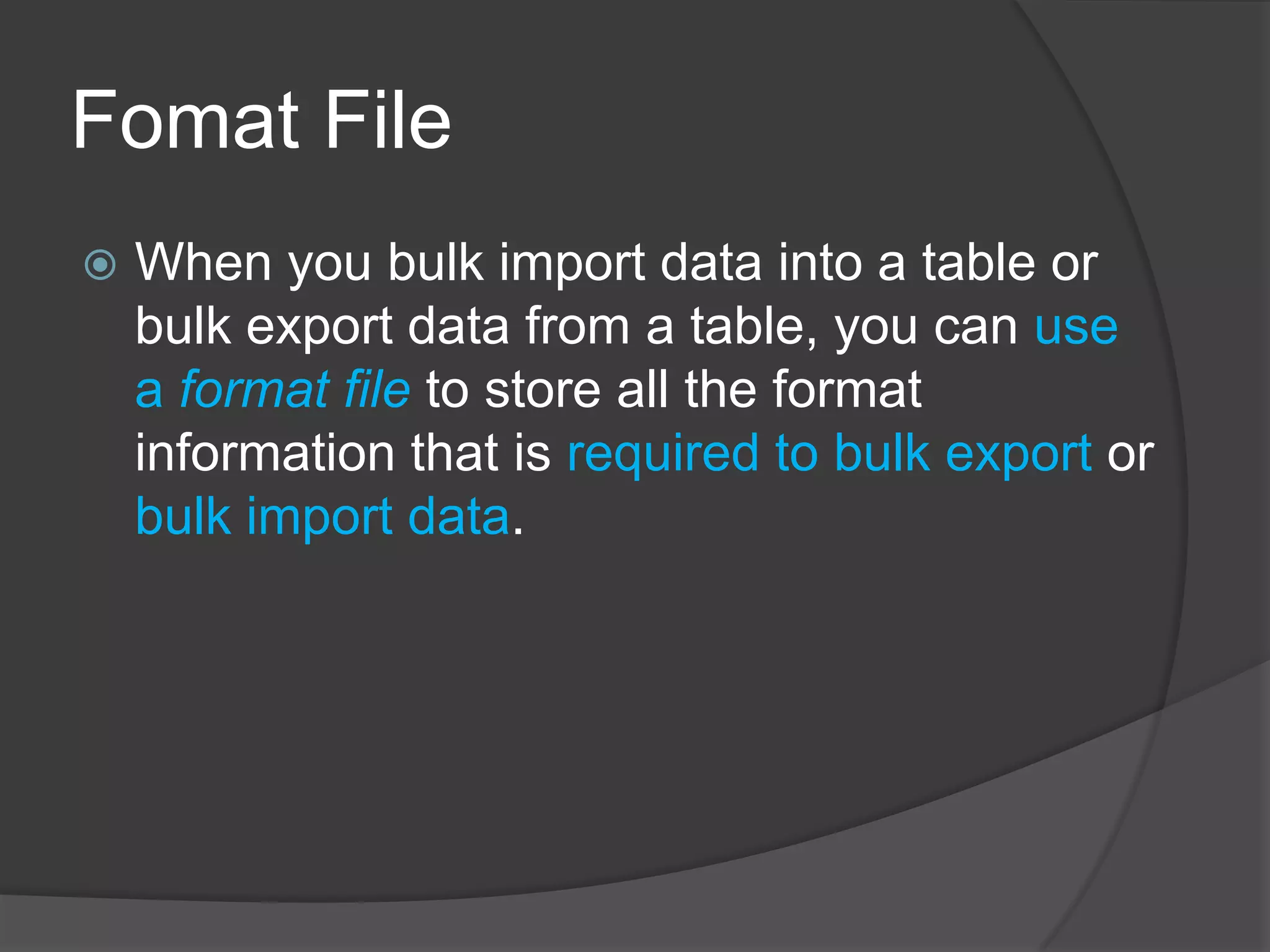Format files are used to store formatting information needed for bulk importing or exporting data between tables or databases. There are two types of format files - XML and non-XML. XML format files use a structured XML format to define field and column mappings and data types. Non-XML format files store mappings in a proprietary binary format. Format files are required when the source data file schema does not match the target table schema, such as when column order or number of fields differ. They ensure data is mapped correctly during bulk operations.