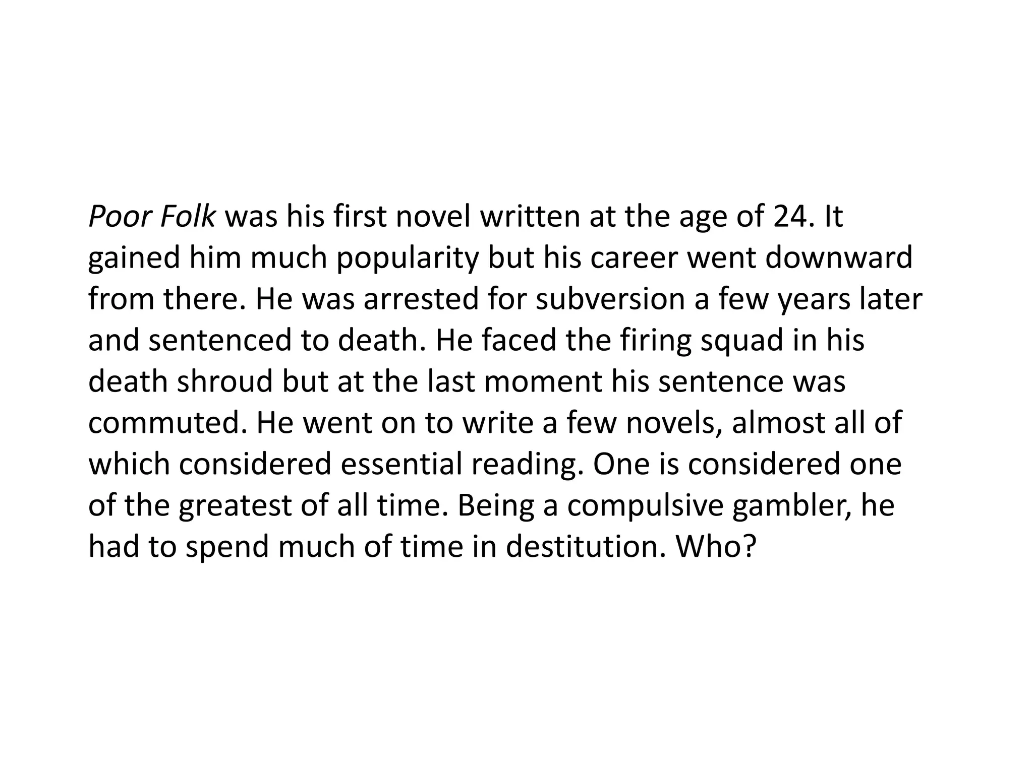 The document describes the career of a Russian author who was initially popular but faced hardship, including being sentenced to death before having his sentence commuted. While facing challenges, he went on to write several novels that are considered essential reading, with one being regarded as one of the greatest of all time. It also discusses his struggles with gambling that led to periods of destitution.
