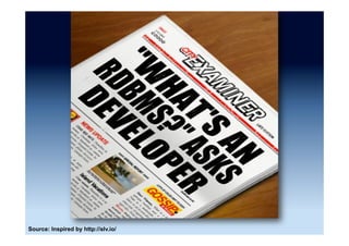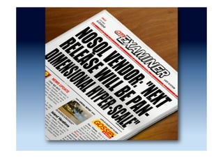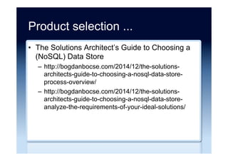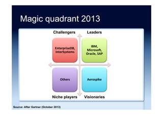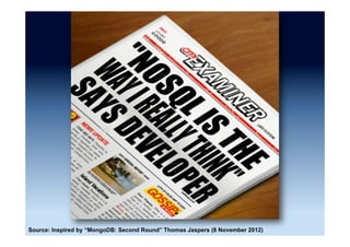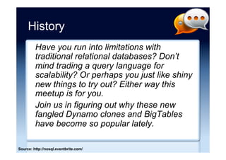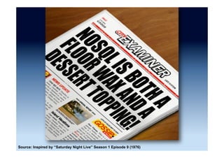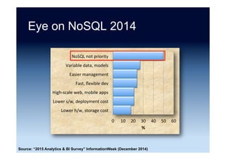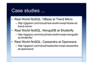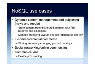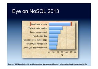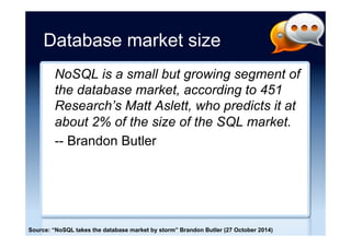 The document discusses the emergence and growth of NoSQL technology, highlighting its appeal to organizations seeking to address new business challenges. It details various NoSQL products, their architectures, and their practical applications, while emphasizing the need for careful consideration of developer skills and product selection. Market analysis indicates that while NoSQL is a growing segment, it remains a small part of the overall database market.