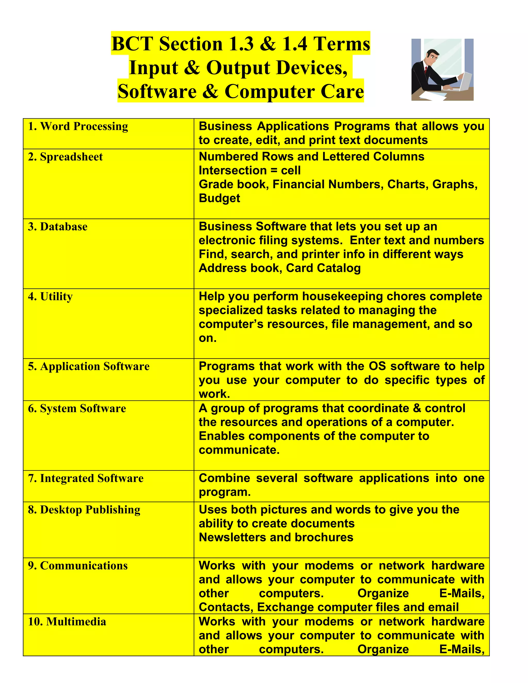 This document defines various types of computer software and hardware. It discusses 1) application software like word processing, spreadsheets, databases, and utilities, 2) system software that coordinates computer resources, 3) integrated software that combines applications, and 4) desktop publishing, communications, and multimedia software. It also describes common input/output devices, storage media like hard drives, floppy disks, CDs, and proper care of computers, disks, and printers. Finally, it discusses maintaining computer systems through logging information, backing up files, and designing comfortable workspaces.