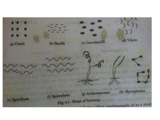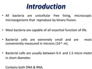 This document summarizes the structure and morphology of bacterial cells. It discusses that bacteria are unicellular and microscopic, between 0.4-1.5 micrometers in size. Bacteria have characteristic shapes including cocci (spherical), bacilli (rod-shaped), and spirals. They contain DNA, RNA, ribosomes, and in some cases plasmids and mesosomes. Bacteria have a cell wall, plasma membrane, flagella or pili for motility, and may contain a capsule or endospores. The cell wall structure differs between gram-positive and gram-negative bacteria.