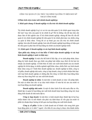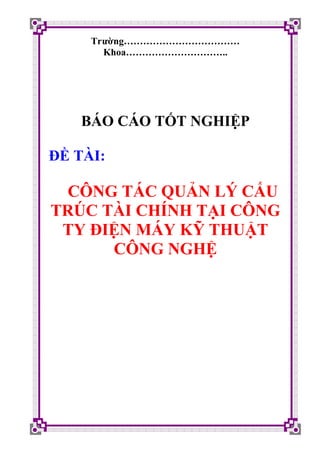 Tài liệu trình bày khái quát về công tác quản lý cấu trúc tài chính tại một công ty điện máy, bao gồm khái niệm về doanh nghiệp, các loại hình doanh nghiệp và tầm quan trọng của cấu trúc tài chính đối với hiệu quả kinh doanh. Nội dung cũng đề cập đến các phương pháp phân tích cấu trúc tài chính doanh nghiệp và các chỉ tiêu để đánh giá tình hình tài chính của doanh nghiệp. Thêm vào đó, tài liệu nhấn mạnh vai trò của các nguồn lực tài chính và cách thức huy động, sử dụng vốn hiệu quả.