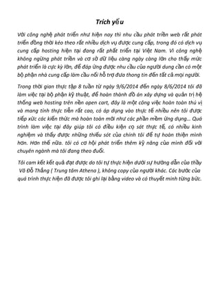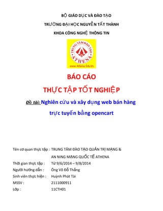Tài liệu là báo cáo thực tập tốt nghiệp của sinh viên Huỳnh Phát Tài tại trung tâm đào tạo quận quản trị mạng & an ninh mạng quốc tế Athena, tập trung vào việc nghiên cứu và xây dựng website bán hàng trực tuyến bằng OpenCart. Trong quá trình thực tập, sinh viên đã hoàn thành dự án xây dựng và quản trị hệ thống website hosting, tiếp thu nhiều kiến thức và kinh nghiệm quý báu phục vụ cho nghề nghiệp trong tương lai. Báo cáo cũng cảm ơn giáo viên hướng dẫn và các nhân viên trong trung tâm đã hỗ trợ trong thời gian thực tập.