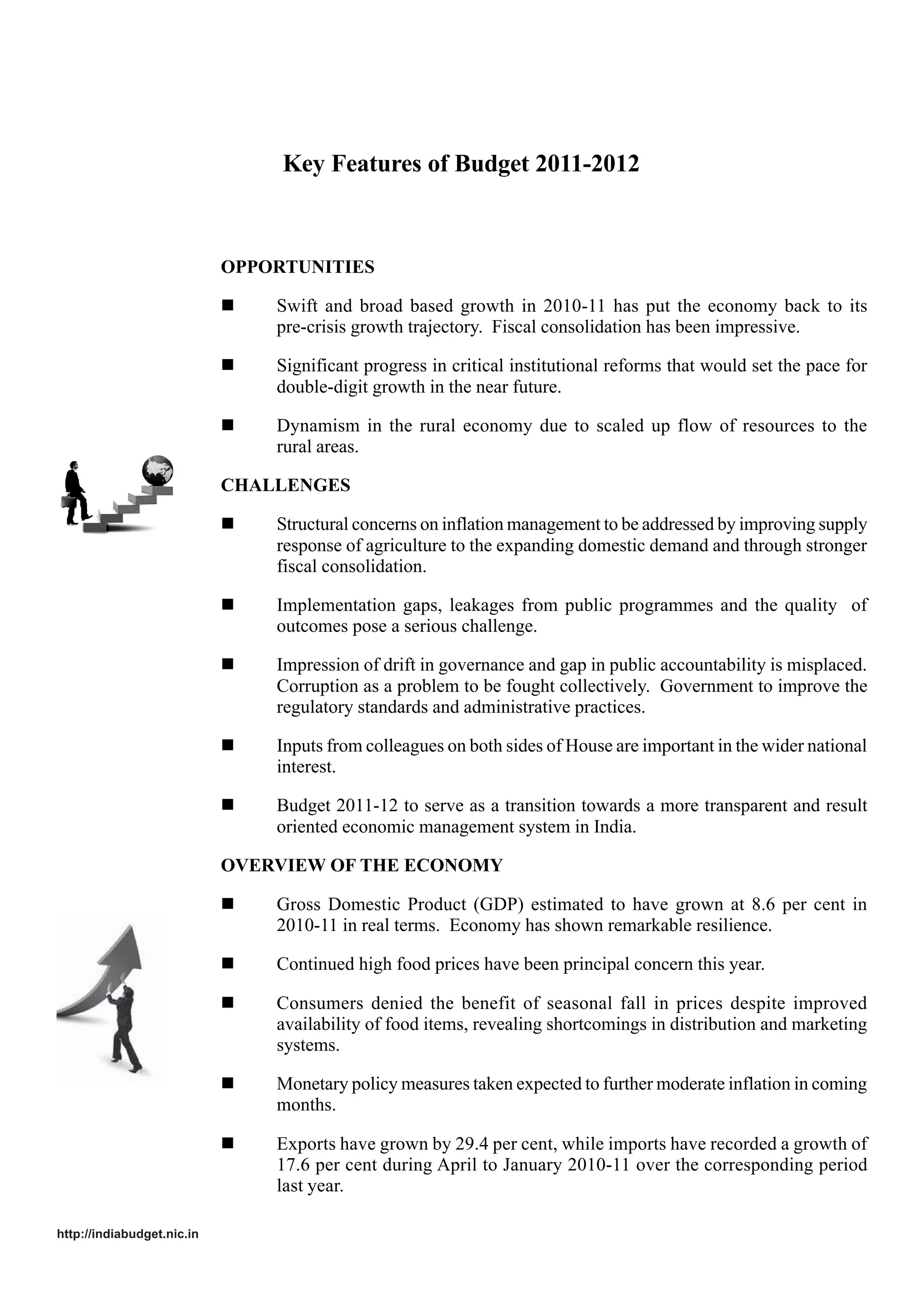 The key features of the Indian budget for 2011-2012 focused on opportunities for growth from economic reforms and rural development, challenges around inflation and implementation gaps, and an overview of the Indian economy growing at an estimated 8.6% in 2010-2011. The budget aimed to sustain growth through fiscal consolidation, tax and expenditure reforms, subsidies, privatization, and improving the investment environment through financial sector reforms and infrastructure development especially in agriculture, manufacturing, and exports. It also strengthened inclusion through social spending on food security, rural development, education, health, financial inclusion, and the unorganized sector while addressing issues like black money, forests, and environmental protection.