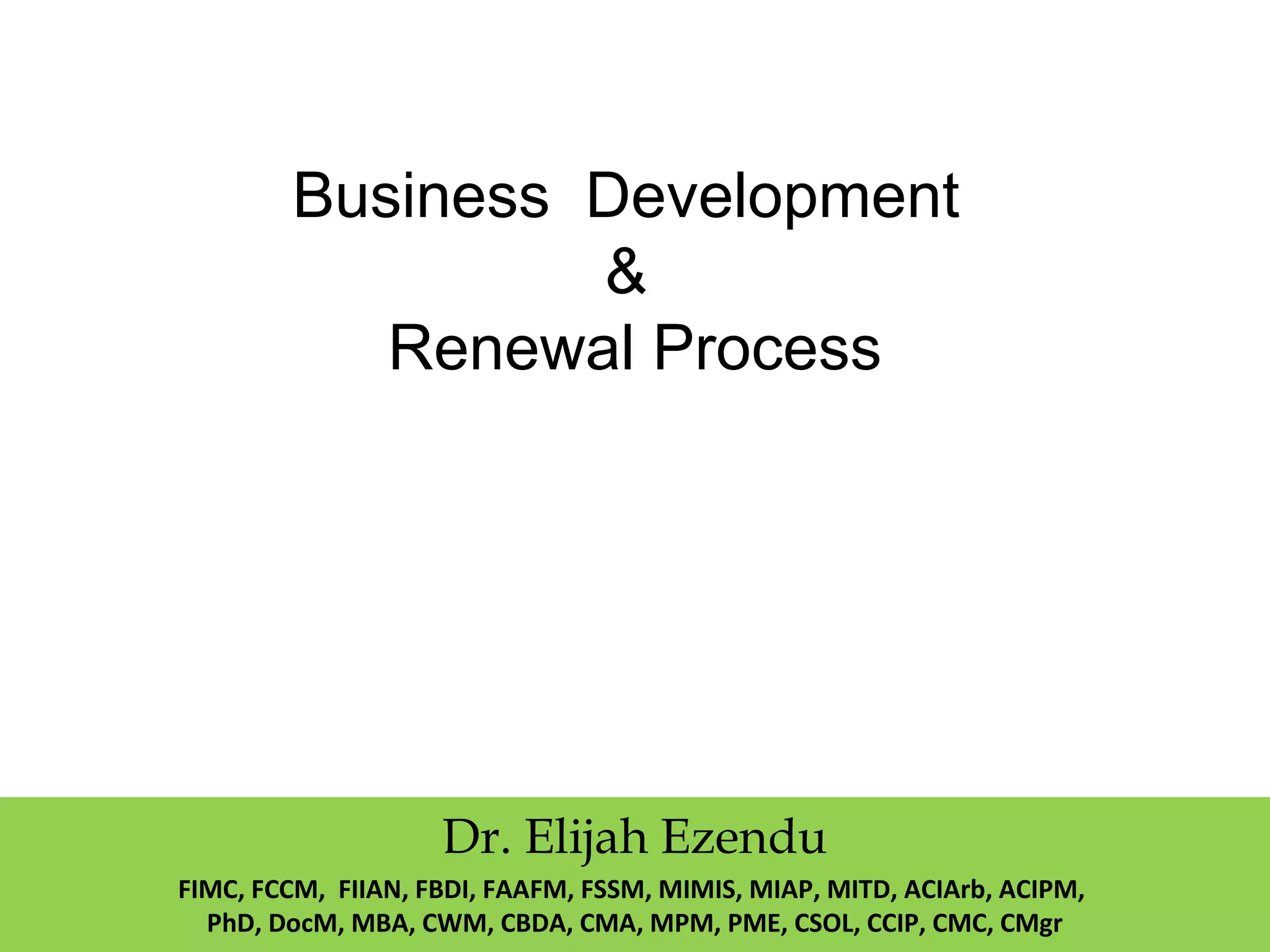 The document outlines the business development and renewal process, detailing the stages of the business life cycle from seed to decline or innovate. It emphasizes the importance of understanding these stages to strategically manage growth and implement renewal strategies effectively, as illustrated by a case study of Philips' transformation. Furthermore, it highlights the expert background of Dr. Elijah Ezendu, who provides insights into successful business growth and development strategies.