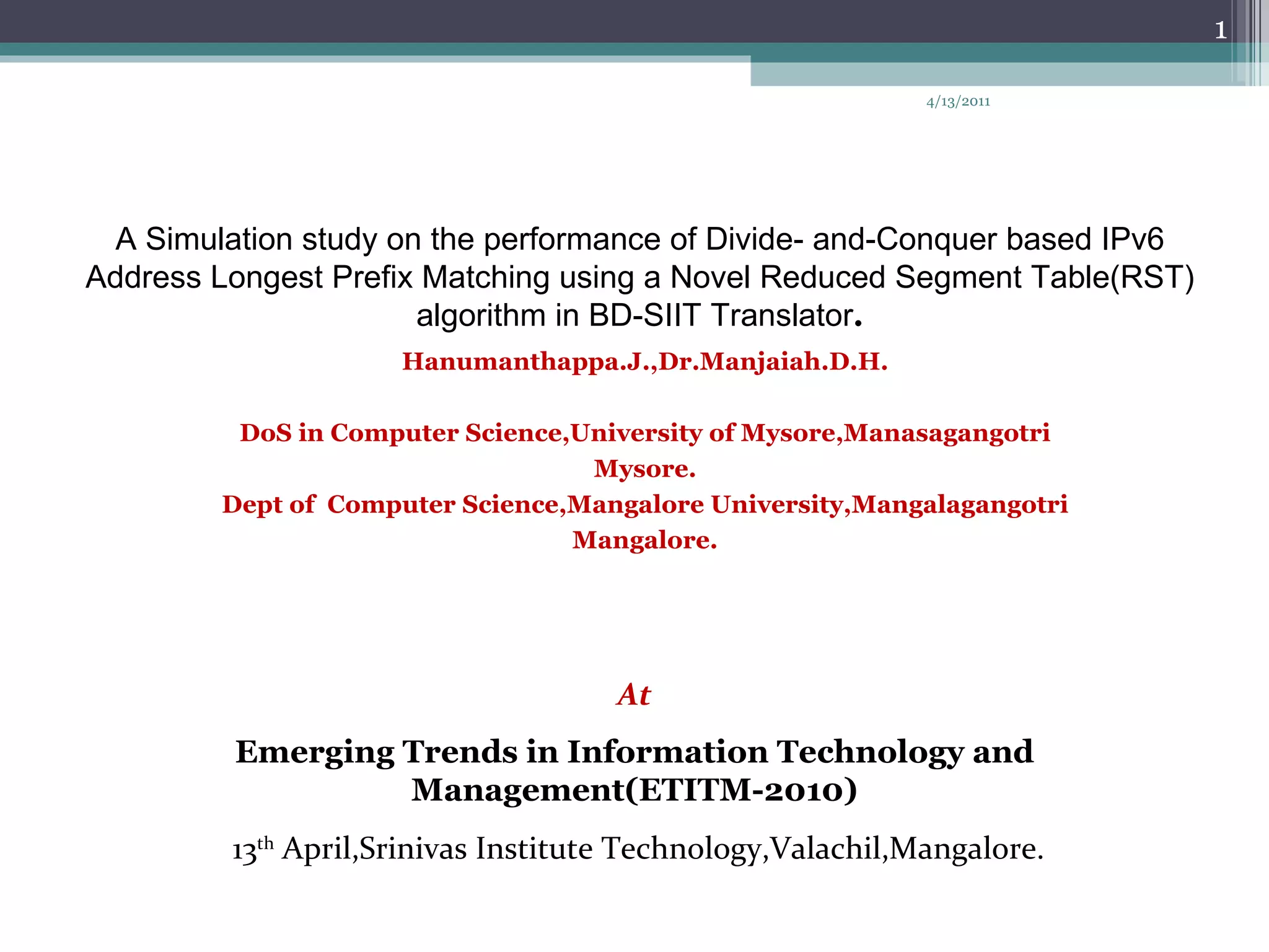 The document summarizes a study on improving the performance of longest prefix matching for IPv6 addresses using a novel Reduced Segment Table algorithm. It proposes a BD-SIIT translator that uses divide-and-conquer techniques to map between IPv6 and IPv4 addresses. Simulation results showed that the BD-SIIT approach outperformed traditional NAT-PT translators in supporting IPv4-IPv6 transitioning. The paper concludes that the BD-SIIT translator provides an effective method for transitioning between the IPv4 and IPv6 protocols.