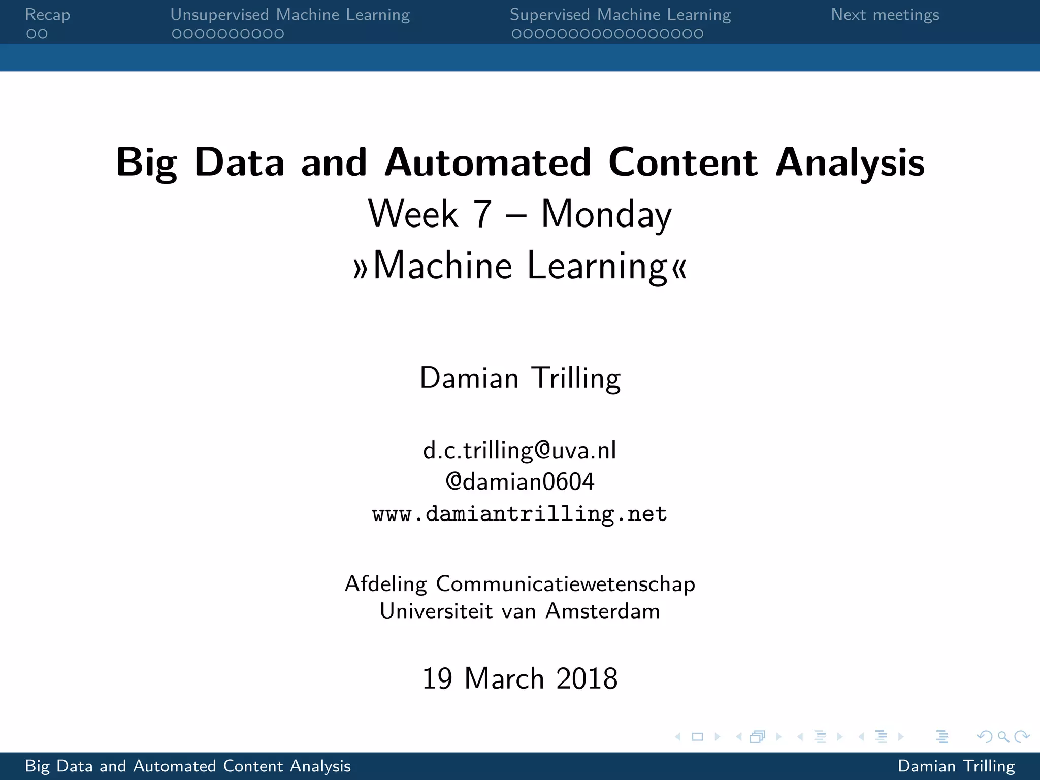 This document provides a summary of a meeting on machine learning. It recaps unsupervised and supervised machine learning techniques. Unsupervised techniques discussed include principal component analysis (PCA) and latent Dirichlet allocation (LDA). PCA is used to find how words co-occur in documents. LDA can be implemented in Python using gensim to infer topics in a collection of documents. Supervised machine learning techniques the audience has previously used are regression models. The document concludes by noting models will only use a portion of available data for training and validation.