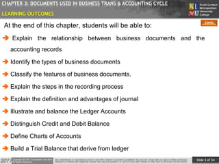 This document provides an overview of Chapter 3 which discusses documents used in business transactions and the accounting cycle. It covers the relationship between business documents and accounting records, the steps in the recording process, types of business documents like invoices and journals, the ledger and trial balance. It also includes sample journal entries, ledger accounts, and a trial balance. The chapter aims to explain how business documents are used to record transactions and flow into the accounting records through journals and ledgers.