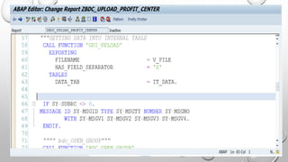 The document outlines the process of transferring data to an SAP R/3 system using Batch Data Communication (BDC). It details the steps involved in data transfer, various methods of BDC such as Batch Input Method, Call Transaction Method, and Direct Input Method, along with the required programming and transaction codes. Additionally, it explains how to handle logical files on the application server and the importance of analyzing data structure for successful uploads.