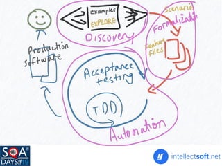 This document discusses BDDfire, a Behavior-Driven Development framework for Ruby. BDDfire includes Capybara for writing acceptance tests, Poltergeist for headless browser testing, parallel_tests for parallel test execution, and tools like Rubocop, CukeSniffer, Yard, RestClient, Axe, Gatling, and Docker to integrate with other development and testing processes. The workshop demonstrated how to set up a BDD project with BDDfire, write tests using Gherkin syntax and predefined steps, and run tests on different browsers and servers.