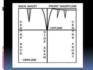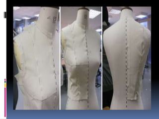 This document discusses key terms and methods related to pattern making. It describes pattern making as the process of manipulating fabric to conform to the human body via a paper template. There are three main methods: drafting uses measurements, draping involves shaping fabric on a form, and flat patternmaking develops basic fitted patterns. Key terms defined include grain lines, darts, balance lines, and pattern pieces like bodice fronts and backs. The document also discusses production patterns, marker makers who lay out patterns efficiently, and fashion-specific terms.