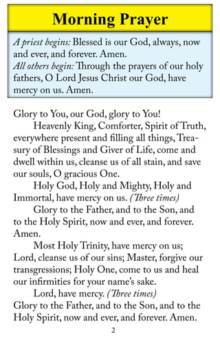 - Opening prayers and hymns calling on God and the Holy Trinity for mercy and salvation.