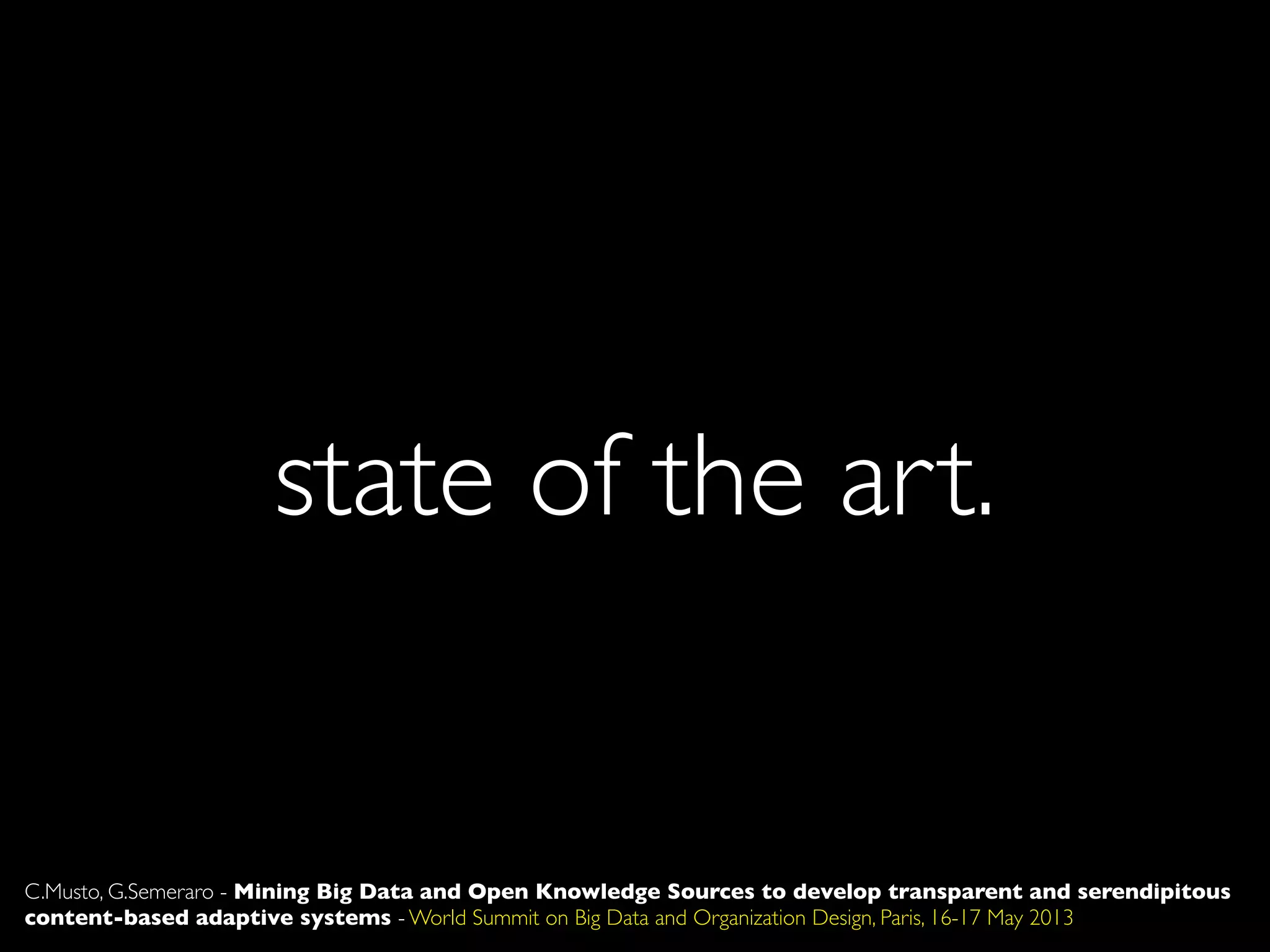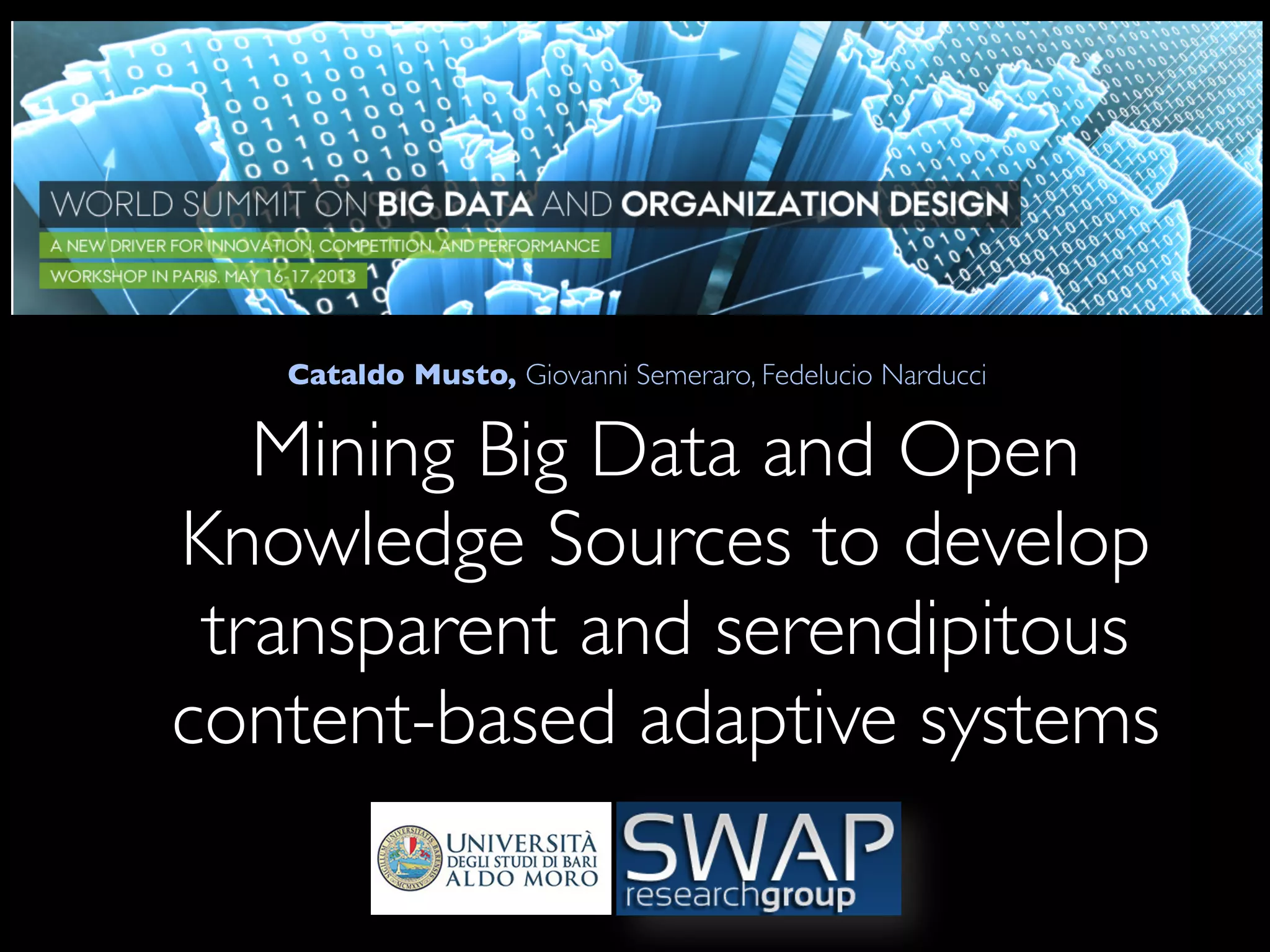 The document discusses developing transparent and serendipitous content-based adaptive systems using big data and open knowledge sources. It identifies three drawbacks of current recommendation technologies: training is a bottleneck, they are black boxes, and suggestions lack surprise. The authors propose a solution exploiting social media to model user preferences, entity linking to make profiles transparent and linked open data aware, and open knowledge sources to increase serendipity. Challenges include data representation and filtering while recommendations include promoting linked open data and interconnecting data silos.