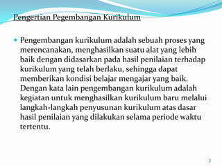Kurikulum adalah rencana pendidikan yang direncanakan untuk membantu peserta didik mencapai tujuan pendidikan melalui pengalaman belajar di dan luar sekolah. Pengembangan kurikulum bertujuan untuk meningkatkan kualitas kurikulum melalui evaluasi dan perbaikan berkelanjutan. Muatan lokal merupakan bagian dari kurikulum yang disesuaikan dengan kondisi sosial budaya daerah untuk melestarikan nilai-nilai lok
