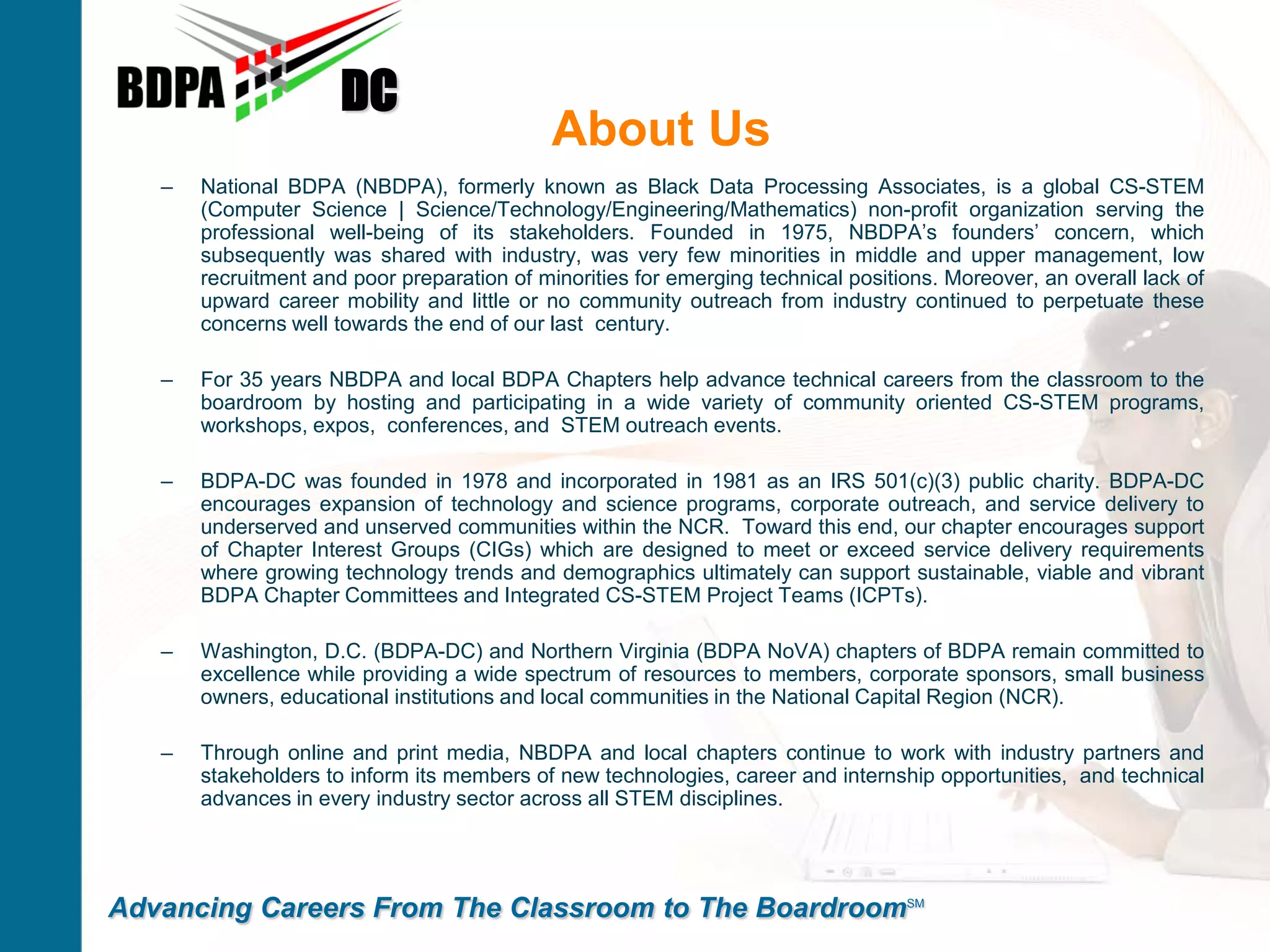 The document provides an overview of the BDPA Washington, D.C. chapter, emphasizing its commitment to promoting diversity in technology through various programs and workshops. Established in 1978, the chapter focuses on advancing the careers of minorities in STEM fields and has achieved notable accomplishments, including scholarships and competitions. The chapter is actively seeking sponsorships and collaborations to enhance its initiatives and support the local community in the National Capital Region.