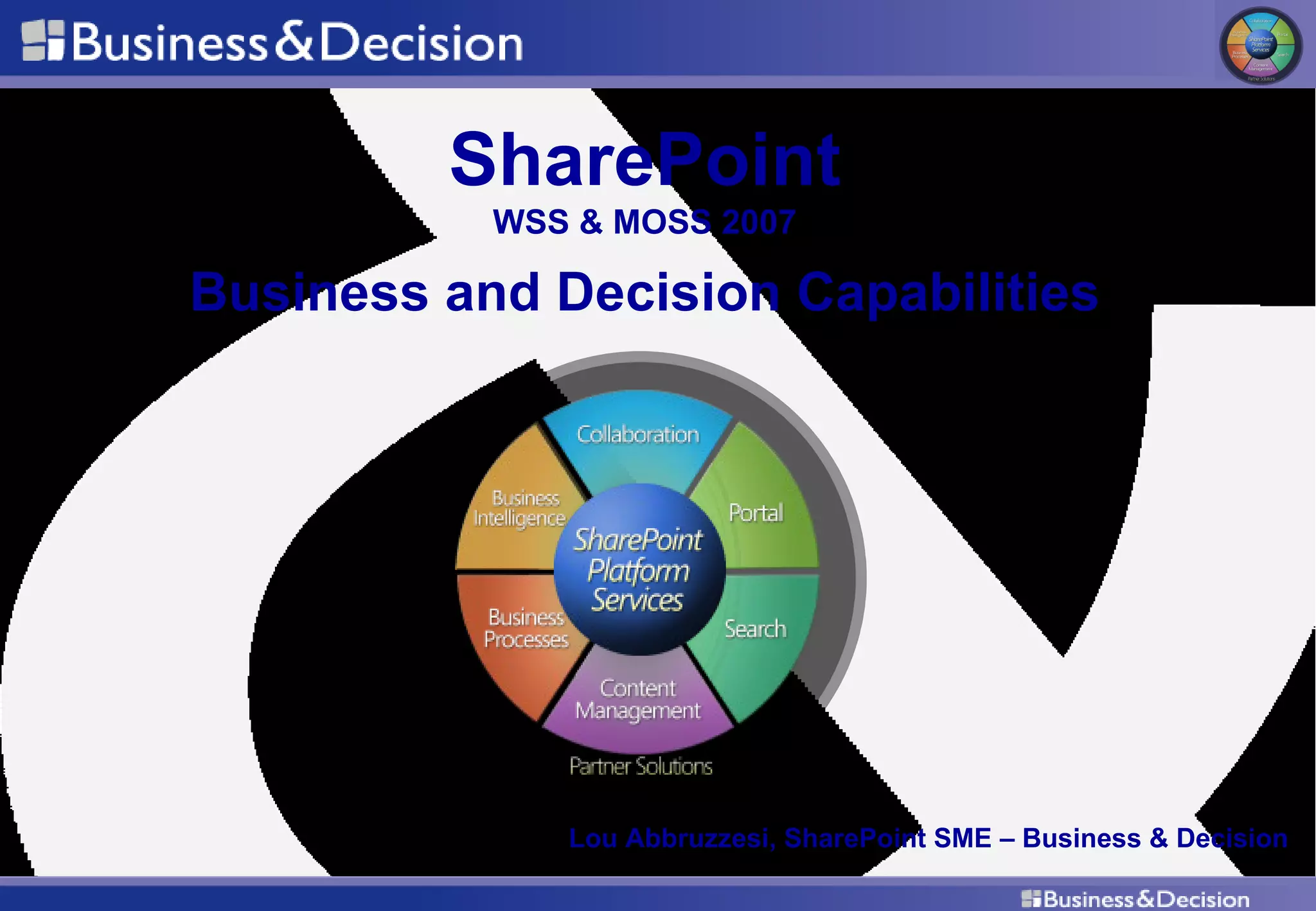 Business and Decision offers a wide range of SharePoint consulting services including assessing business needs, designing farm topologies, implementing solutions, application support and monitoring, and disaster recovery. They help clients leverage SharePoint to improve business processes, build prototypes, and create business cases. For implementations, they assist with resource planning, information architecture, requirements gathering, custom development, integration, and application support after deployment.