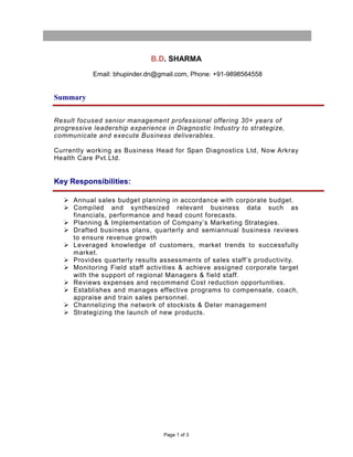 The document provides a summary and experience details of B.D. SHARMA, a senior management professional with over 30 years of experience in the diagnostic industry. As the current Business Head for Span Diagnostics Ltd, now Arkray Health Care Pvt. Ltd., his key responsibilities include annual sales budget planning, marketing strategies, business reviews, monitoring field staff, and product launches. He has held various regional and business head roles over his 30+ year career in diagnostic and pharmaceutical companies.