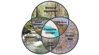The document provides details of a wetland restoration project at the Santee Experimental Forest in South Carolina. The objectives are to restore hydrology, soils, and habitat through approaches like channel filling and installing water control structures. Soil samples found sandy soils suitable for wetland growth. Modeling assessed pre-development flooding and erosion conditions and how post-development changes like channel filling and adding a weir would impact water flow and storage. The results inform the final design recommendations.