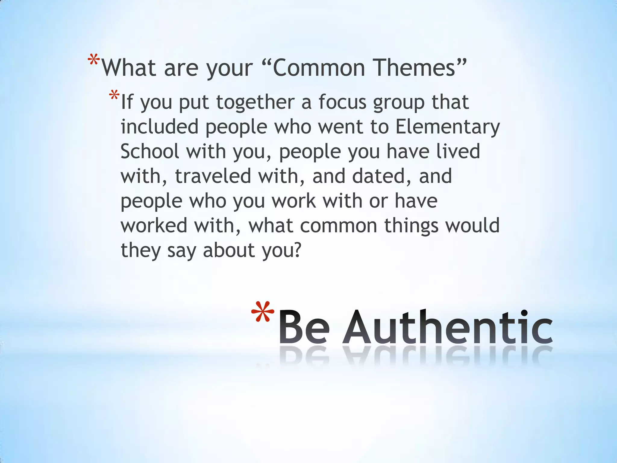This document discusses ways to live authentically by focusing on common themes from your past, making others feel positively through interactions, feeding positive thoughts and feelings about yourself, identifying real friends who appreciate you for who you are, being prepared physically and mentally to respond from a place of authenticity, expressing your individuality, doing what makes you happy, and spending the new year doing things you love and with people who bring out the best in you.
