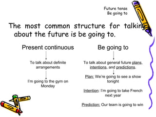 1) Be going to is a common structure for talking about future plans, intentions, and predictions in English. It is used to talk about definite arrangements or general future plans.