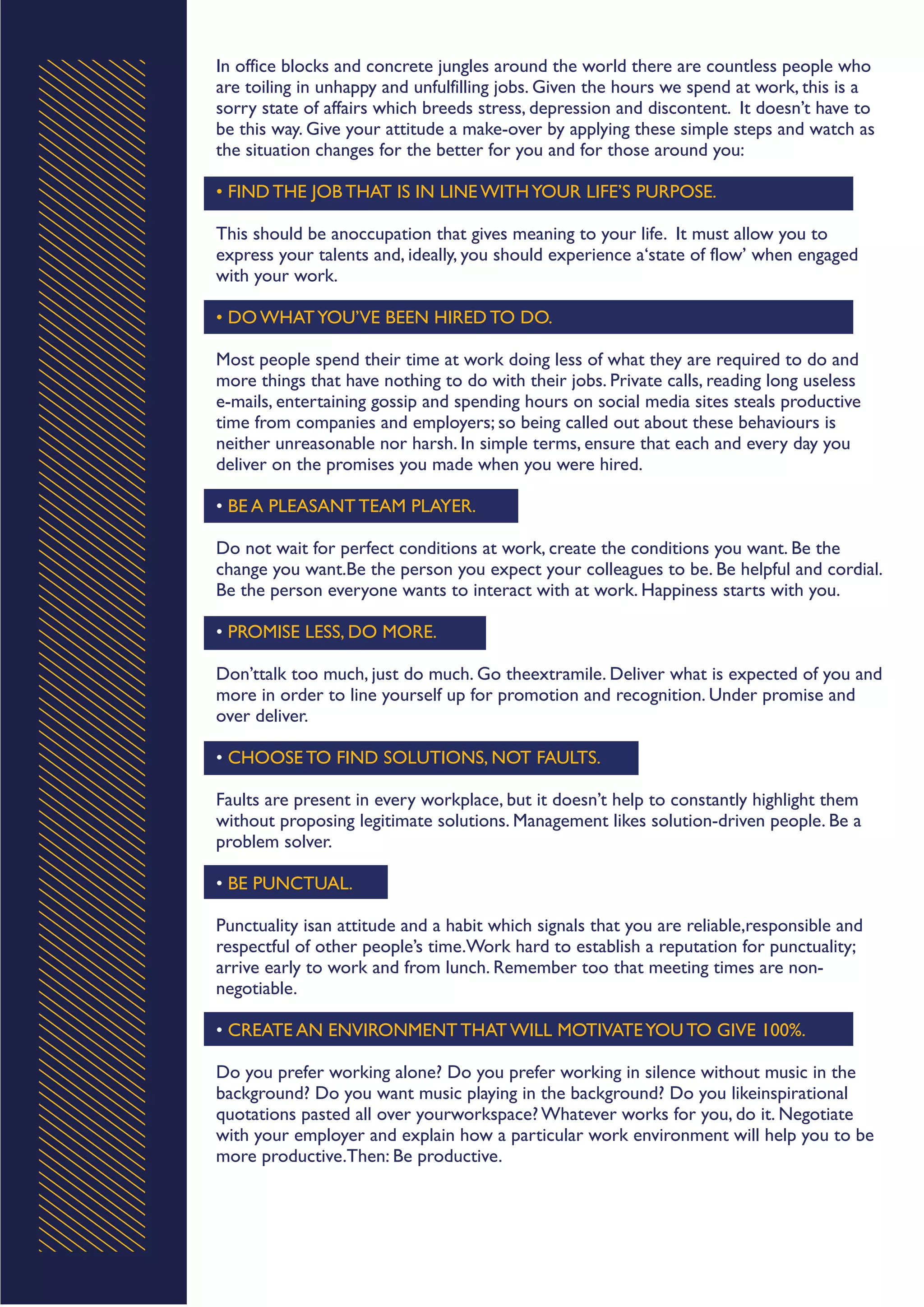 This document provides 7 essential strategies for making work more fulfilling: 1) Find a job that aligns with your life's purpose and allows you to use your talents; 2) Do the work you were hired to do and avoid distractions; 3) Be a pleasant team player who helps others; 4) Underpromise and overdeliver on your responsibilities; 5) Focus on finding solutions rather than faults; 6) Be punctual and reliable; 7) Create a work environment that motivates you to give your best efforts. Implementing these simple steps can improve your attitude and the work situation for yourself and colleagues.