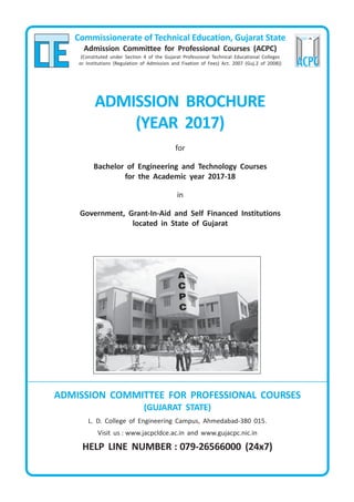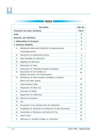 The document outlines the admission modality for Bachelor of Engineering and Technology courses in Gujarat for the 2017-18 academic year. It details the eligibility criteria, categories of available seats including government and management seats, reservation policies, and procedures for registration and admission counseling. Key points covered are modalities for admission, seats available in government/aided/unaided institutions, eligibility criteria based on qualifying exam and boards, reservation of seats for different categories, and guidelines for the online admission process.