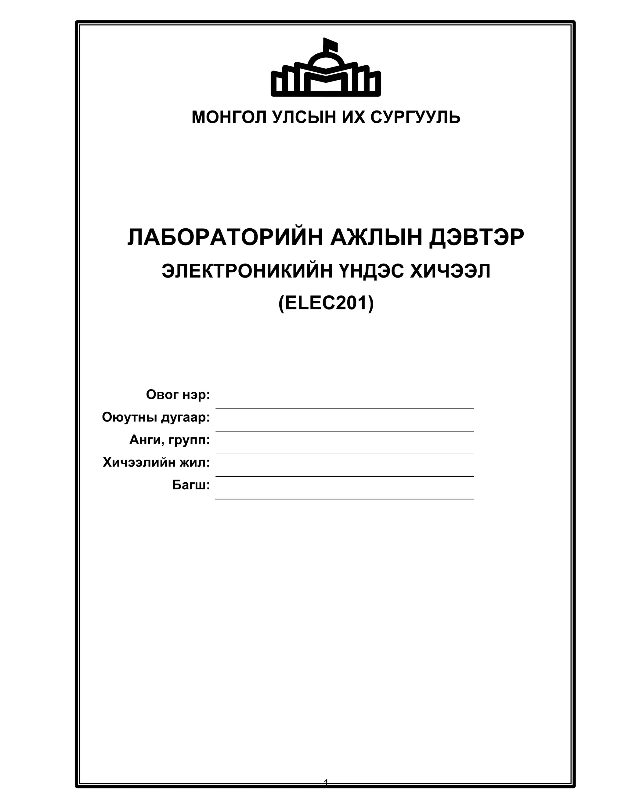 хэлхээний эсэргүүцэгчийн нөлөөг судлана. Үүний тулд 6.5.3 дасгал болон 6.5.6 дасгалуудад угсарсан хэлхээнүүдэд VСE хүчдлийг мультиметр ашиглан хэмжинэ. Дараа нь хэлхээ тус бүрд транзистороо 10 сек орчим халаагаад хэмжилтийг давтаж гарч буй өөрчлөлтүүдэд дүгнэлт хий. VCЕ 6.5.3 дасгалд 6.5.6 дасгалд халаагүй халсан халаагүй халсан 6.6. Сорих асуулт 6.6.1. NPN болон PNP транзисторуудын ялгаа юу вэ? 6.6.2. Ханалтын төлөвт байгаа транзисторын коллектор-эмиттерийн хүчдэл ямар утгатай байх вэ? 6.6.3. Хэлхээнд холбоотой байгаа транзистор хэрчилтийн төлөвт байвал коллектор- эмиттерийн хүчдэл ямар утгатай байх вэ? 6.6.4. Коллекторын хэлхээний эсэргүүцэгч буюу ачааллын эсэргүүцэгчийг хэт багасгавал ямар үр дүнд хүрэх вэ? 6.6.5. Баазын хэлхээний эсэргүүцэгчийг хэт багасгавал ямар үр дүнд хүрэх вэ? Огноо Үнэлэлт Багшийн нэр Гарын үсэг Хэмжих зөвшөөрөл Хэмжсэн байдал Хамгаалсан байдал 30