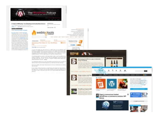 This document discusses the author's involvement in the WordPress community over many years. It begins with the author's early experiences using WordPress and participating in support forums. It then describes attending WordCamp conferences starting in 2006 and meetups in Philadelphia. The document encourages readers to get involved by attending local meetups, contributing code or documentation, asking questions, and providing user support. In the end, it emphasizes that the community has grown globally and there are many ways to contribute beyond just coding.