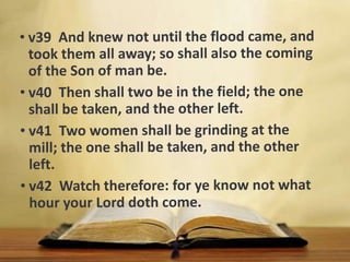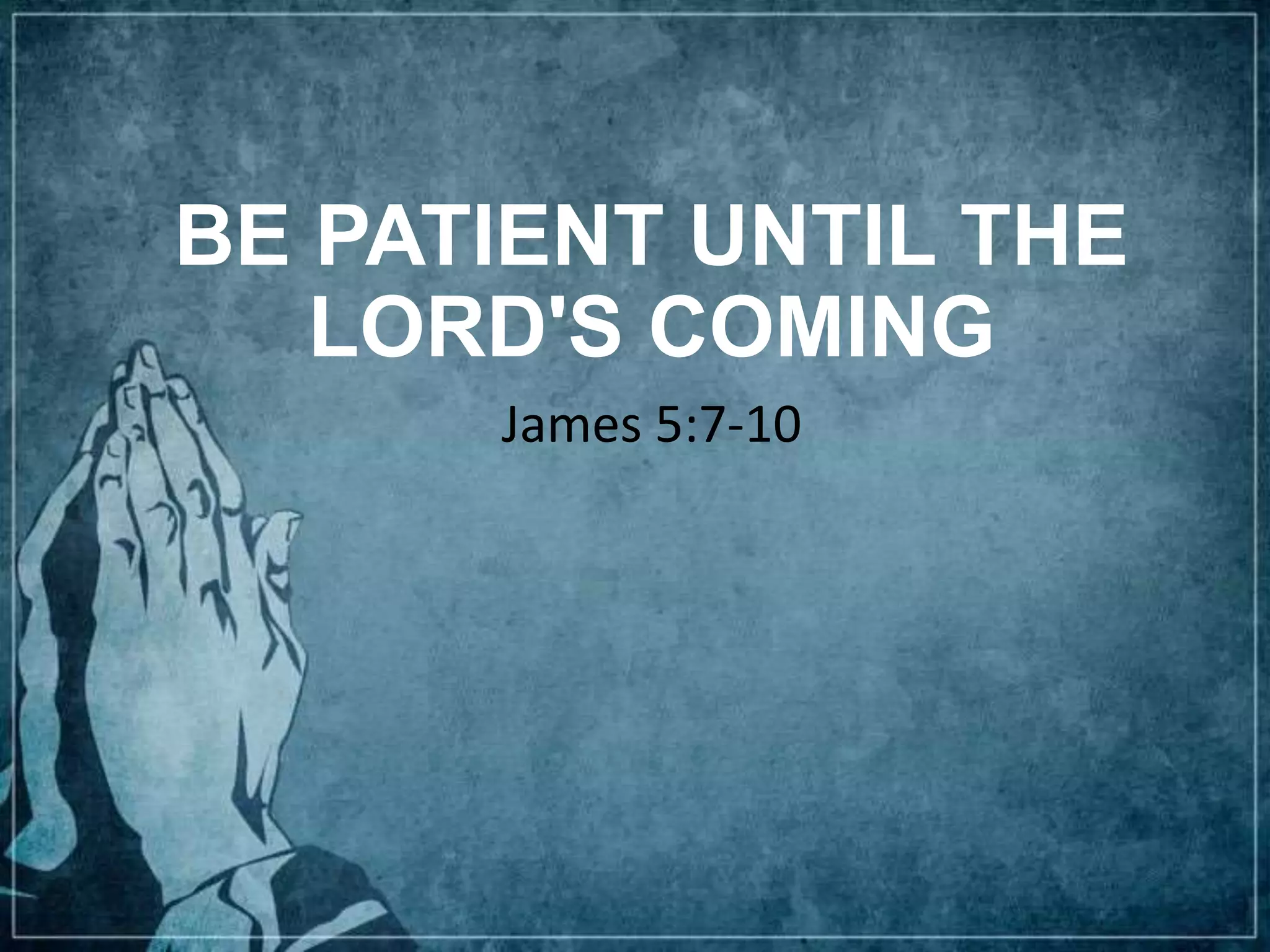 The document discusses being patient as Christians await the return of Jesus Christ. It encourages believers to watch and pray constantly, strengthening their relationship with God, as the timing of Christ's coming cannot be known but will be sudden and unexpected. Believers are told to stay devoted to their faith and the church's activities, since the judge is "standing at the door" and could return at any moment. Christians are warned to always be prepared and wait patiently as they go about their daily lives.