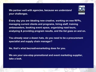 The document describes the event marketing and promotional services provided by becreativemarketing, including custom displays, apparel, print materials, premiums, and fulfillment. It highlights how the company can manage all sourcing, procurement, production, and shipping needs for promotional programs to allow agencies to focus on creative development and execution. Examples of projects for clients like COVERGIRL, Nintendo, Clorox, and State Farm demonstrate becreativemarketing's full-service capabilities.