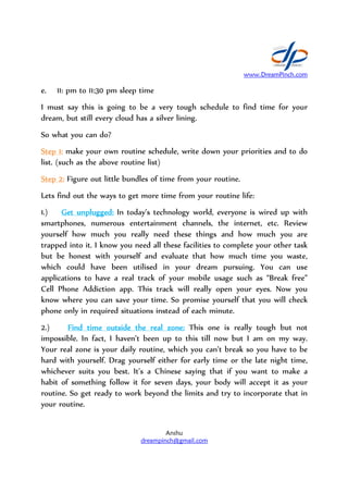 The document discusses how individuals often perceive a lack of time as an obstacle to pursuing their goals, despite everyone having the same 24 hours. It offers practical steps to better manage time, such as creating a daily routine, identifying wasted time, sharing responsibilities, and utilizing technology to streamline tasks. The overall message emphasizes that with effort and proper scheduling, individuals can find time to achieve their dreams.