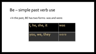 The document discusses the use of the verb "be" in the simple past tense. It states that "be" has two forms in the past - "was" and "were". It is used with adjectives, nouns, and locations. Subject + be + adjective/noun/location. The verb "be" is different from other verbs in that it is easier to form negatives and questions with it in the past tense. Questions are formed by changing the word order to be + subject.