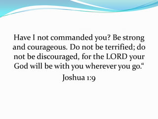 God commands believers to be strong and courageous, and not to be afraid or discouraged, because He will always be with them. The document provides examples from the Bible where God performed mighty acts, such as parting the Red Sea and feeding multitudes with few resources, to illustrate that He is capable of handling any situation. It concludes by emphasizing that God is "big enough" for anything and reminds readers to follow His instruction to be brave with His presence and help.