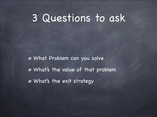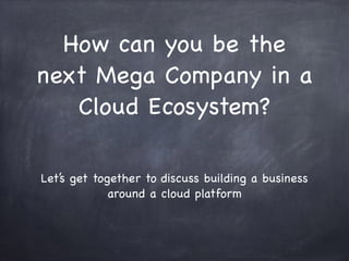 The document discusses building a business around a cloud platform and provides advice for entrepreneurs. It suggests entrepreneurs ask what problem their business can solve, the value of solving that problem, and what their exit strategy is. The document also recommends bringing together experienced entrepreneurs, people just starting out, and customers to share ideas on building successful cloud-based businesses.