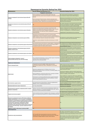 Документ описывает возможности и ограничения систем резервного копирования Acronis Backup and Recovery 11.5 и Symantec Backup Exec 2014 для различных платформ, таких как Microsoft Exchange, SharePoint и Active Directory. Отмечены особенности восстановления данных, включая автоматизацию процессов, а также ограничения в лицензировании и аппаратных требованиях. Также упоминаются технологии дедупликации и синтетического резервного копирования, с акцентом на их применение и поддержку различных операционных систем.