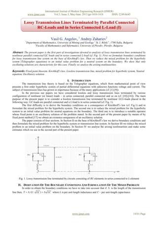 The document presents an analysis of lossy transmission lines terminated by nonlinear parallel connected GC loads and series connected L-load. It formulates the boundary conditions for the system based on Kirchhoff's law and reduces the mixed problem for the hyperbolic system of equations to an initial value problem for a neutral system on the boundary. The analysis shows that only oscillating solutions are characteristic for this configuration and the nonlinearities that arise are also examined.