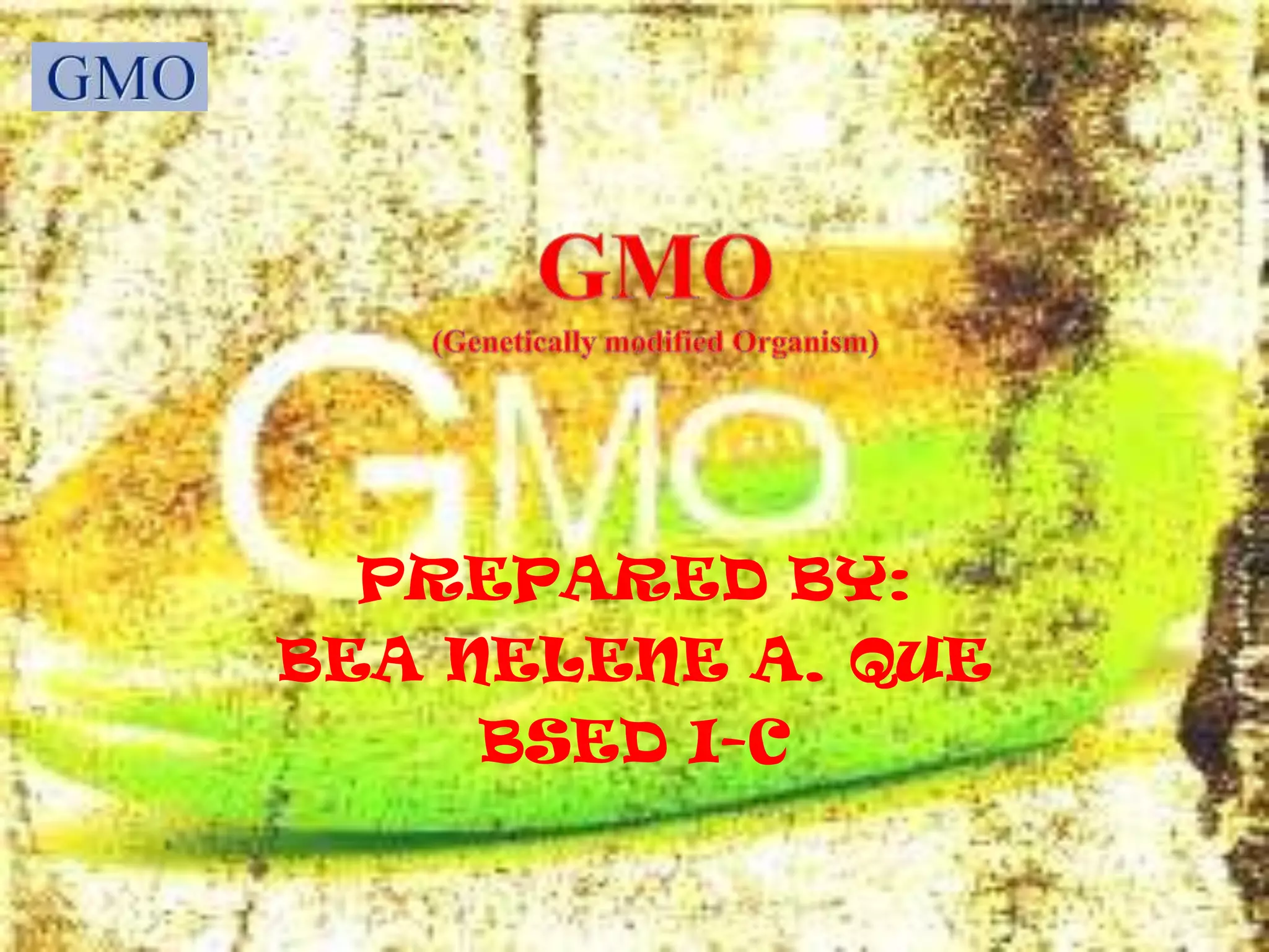 Genetically modified organisms (GMOs) are organisms whose genetic material has been altered using genetic engineering techniques. This involves transferring genes from one organism into another, such as genes from bacteria being inserted into crops like corn and soybeans. Potential advantages include increased pest and disease resistance, higher yields, and using fewer pesticides and fertilizers. However, potential disadvantages include risks to human health, the environment if GMO genes spread to weeds and pests, and economic concerns about corporate control of the food supply. Golden rice is an example of a GMO developed to increase vitamin A levels, but critics argue this could increase corporate dependence for farmers.