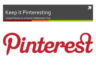 Pinterest is a social media platform where users can create boards to organize and share images and other visual content on various topics. It allows for collaborative boards where multiple users can add pins. Some ways Pinterest can be used for course collaboration include having students pin design inspirations, social media content, photos, videos and other materials to shared boards. This allows for peer feedback and critique. Pinterest engagement has been growing and many students are already active on the platform, making it a useful tool to connect classroom content with students' online activities.
