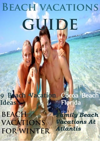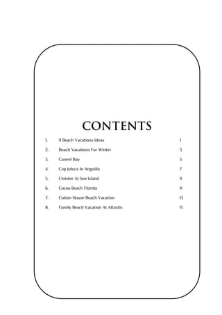 The document is a comprehensive guide to various beach vacation ideas and resorts, including destinations in Hawaii, Florida, and the Caribbean. It highlights options for families, luxury experiences, and activities available at each location. Specific resorts like the Atlantis in the Bahamas and Cap Juluca in Anguilla are detailed, showcasing the unique features and attractions they offer.