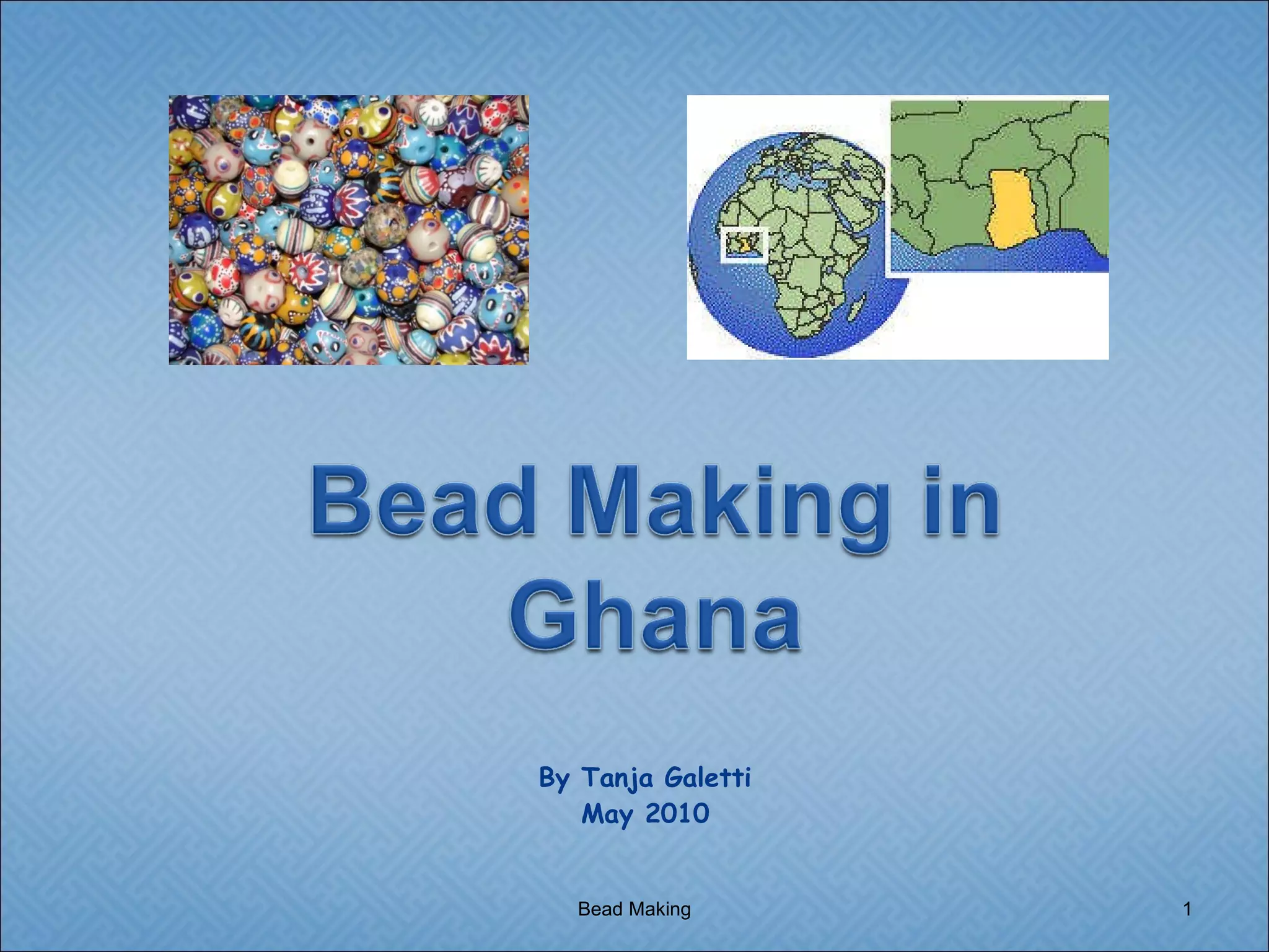 The document summarizes the process for making glass beads in Ghana. Broken glass bottles are crushed into small pieces and placed into clay molds of different shapes and sizes. The molds are fired in a kiln, melting the glass into beads. The beads are then shaped, polished, strung onto threads, and either displayed in shops or delivered to customers. A second type of bead involves pulverizing glass into powder before placing it in molds, then hand-painting and refiring the beads after cooling.