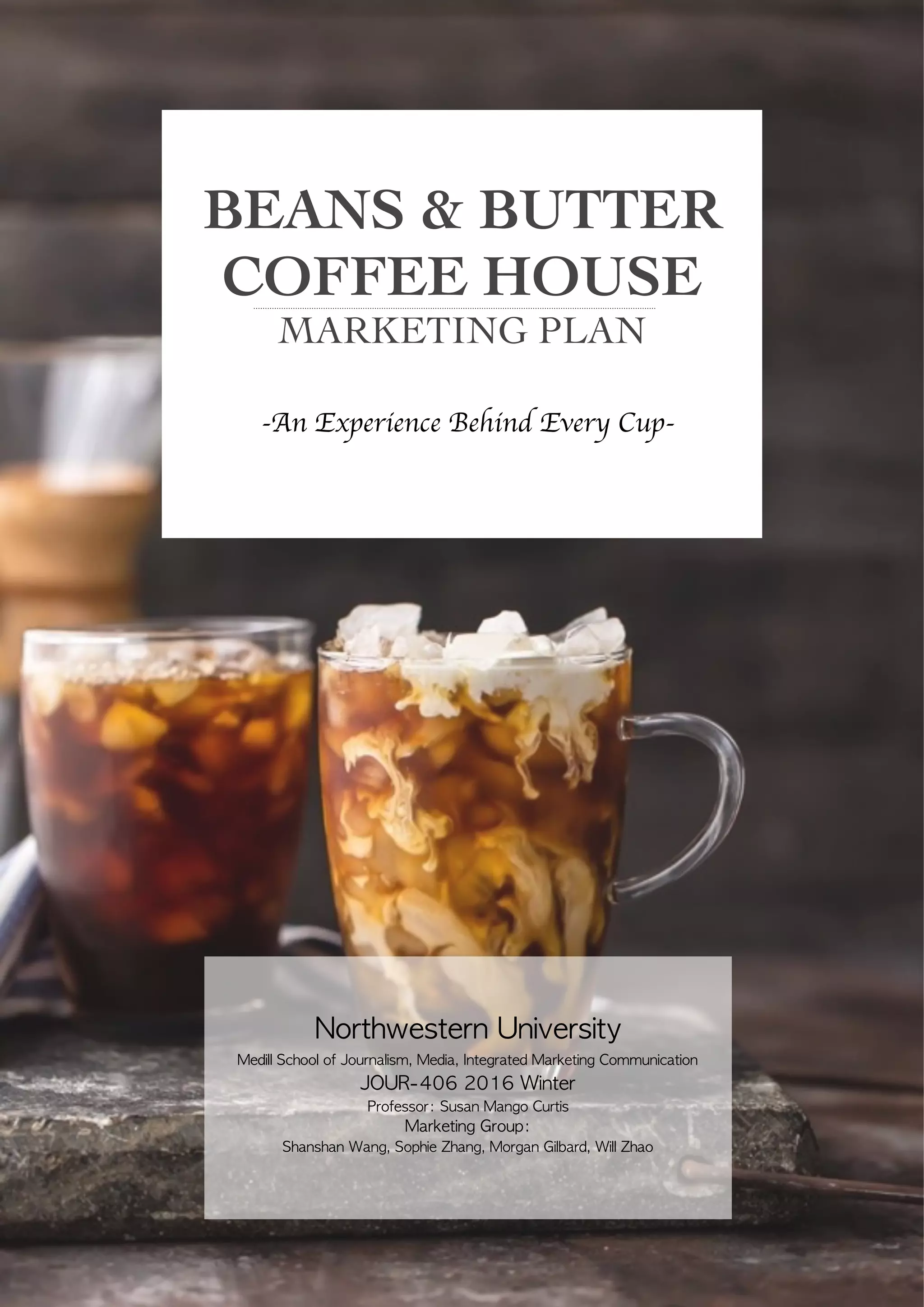 Beans & Butter is a coffee shop located in Lawrenceville, GA seeking to become a home-like destination for local coffee lovers. The marketing plan provides an analysis of the business, including its target demographics of college-educated professionals in the area, competitive local coffee shops, and its strategy to offer high-quality locally sourced coffee, baked goods, and a creative atmosphere to build community. The plan recommends emphasizing the shop's local identity, organic products, and social engagement to attract customers and establish B&B as a unique local business.