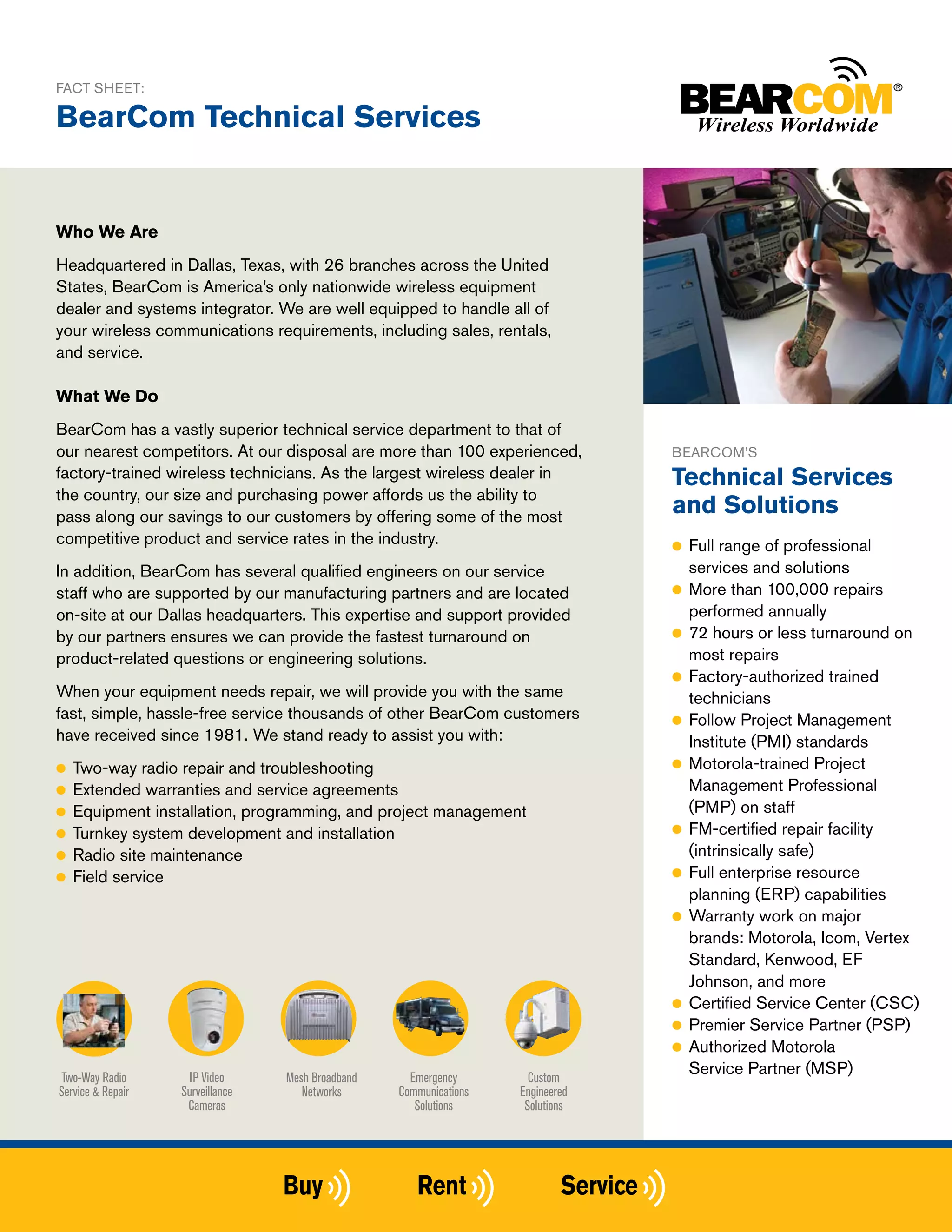 BearCom, headquartered in Dallas, Texas, is America's only nationwide wireless equipment dealer and systems integrator, offering a comprehensive range of wireless communication solutions including sales, rentals, and extensive technical services. With over 100 factory-trained technicians and a focus on customer service, BearCom provides fast turnaround on repairs and tailored service agreements to meet customer needs. The company operates 26 branches across the U.S. and emphasizes quality through its relationships with major manufacturers like Motorola and Icom.