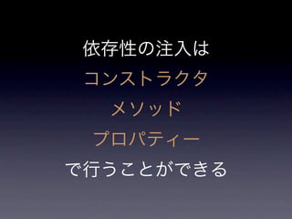 The document discusses dependency injection (DI) in PHP using the BEAR framework. It shows how DI allows classes to declare dependencies without knowing how to instantiate them. The User class declares a dependency on a Storage interface without knowing the concrete class. The document provides various examples of injecting dependencies into classes through the constructor, setter methods, and a global dependency registry. It also demonstrates how to configure DI with options like injector callbacks and persistent objects.