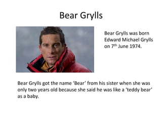 Bear Grylls was born in 1974 and got his nickname "Bear" from his sister as a baby. He left school to join the British Army and served with the Territorial Army and SAS. He has had an illustrious adventure career, climbing Everest and making daring crossings of oceans. Grylls became famous for his TV show "Man vs Wild" and has authored many books, including his autobiography "Mud, Sweat, and Tears". He also served as the youngest Chief Scout and sells outdoor apparel bearing his name.