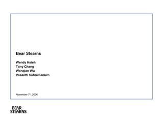 Bear Stearns is a global investment bank founded in 1923 that focuses on capital markets, wealth management, and global clearing services. It employs around 11,000 people worldwide with offices across the US and internationally. Recent financial results have shown increases in revenues and profits across its business segments.