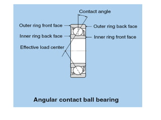This document discusses different types of bearings. It begins by defining a bearing as a device that allows constrained relative motion between two parts, typically rotation or linear movement. It then classifies bearings based on the motions they allow and their principle of operation. The document goes on to describe various types of bearings in detail, including ball bearings, roller bearings, thrust bearings, tapered roller bearings, and cylindrical roller bearings. It provides information on the characteristics, advantages, applications, and physical features of each bearing type.